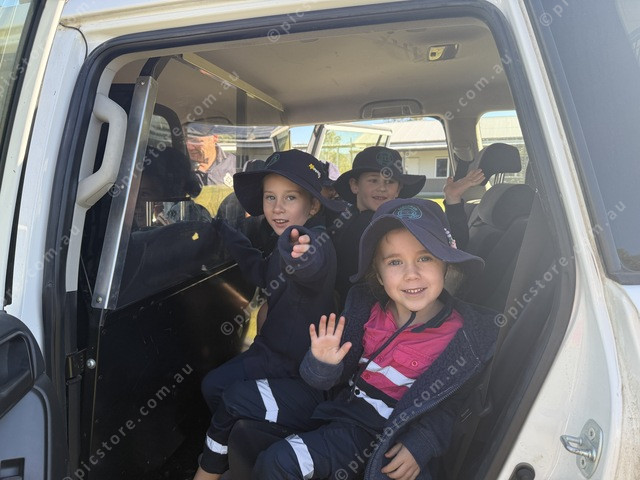 The six-year-old Tamrookum students were thrilled to pile into a police car. (Larraine Sathicq: 484119_08)