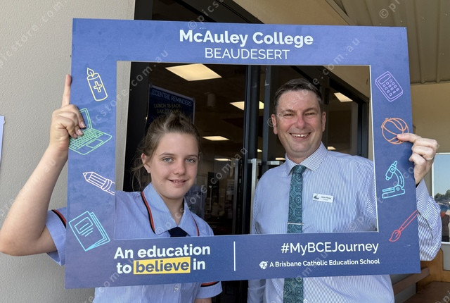 Year 7 student Mollie McCarron with Principal Jason Pacey at McAuley College. (Larraine Sathicq: 531449_03)