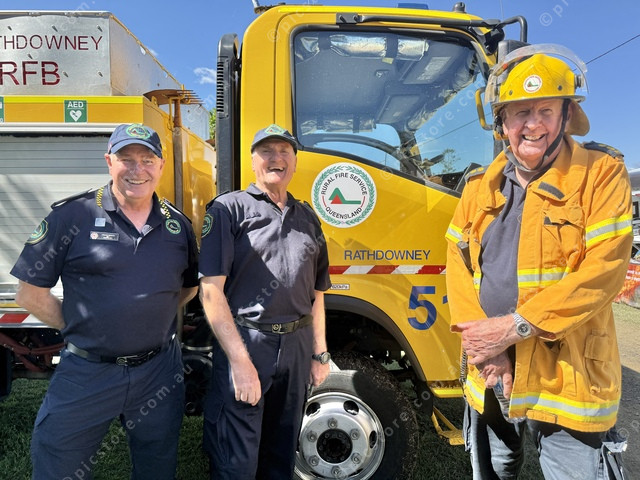Representing the rural fire brigade at the Rathdowney Spring Fair, Craig Winch, Brian Gillespie and Ian Richter. (Larraine Sathicq: 505065_03