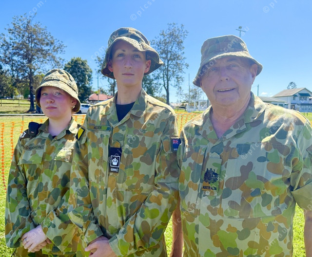 Jimboomba cadetsLance Corporal Charli McKinnon and Squadron Sergeant Major Thomas Koen with their instructor Brian McInnis on duty at the Spring Fair. (Larraine Sathicq: 505065_07)