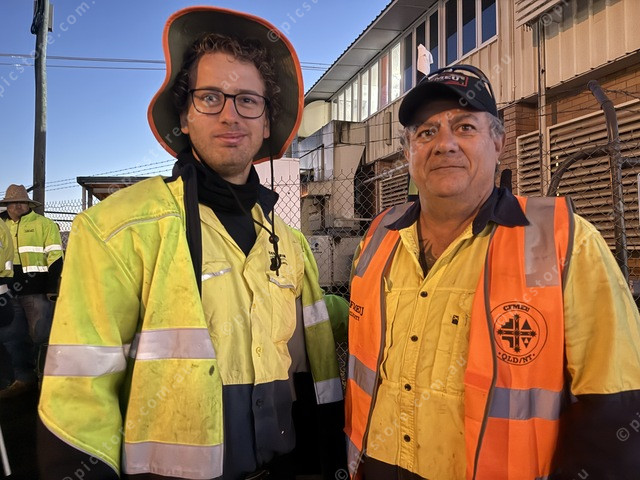 Jake Murray with CFMEU delegate “Wiggy” after the union vote to stop work. (Larraine Sathicq: 492400_04)