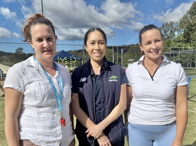 Moriarty Park Community Sporting Centre president Stacey Collins with Lellie Melia from Tennis Queensland and MPCSC secretary Rickie Glocker at Moriarty Park tennis courts. (Larraine Sathicq: 491031_01)
