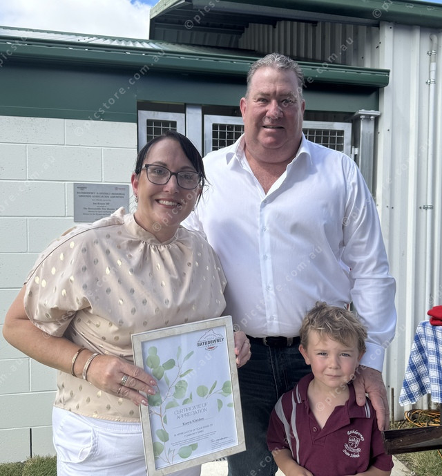 Karyn Kleidon receives a certificate of appreciation from Mayor Tom Sharp and Rathdowney State School Student Reuben Smith. (Larraine Sathicq: 467249_02)