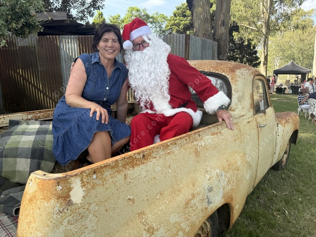 Kay Tommerup takes a break with Santa on the rusty farm ute. (Larraine Sathicq: 522939_01)