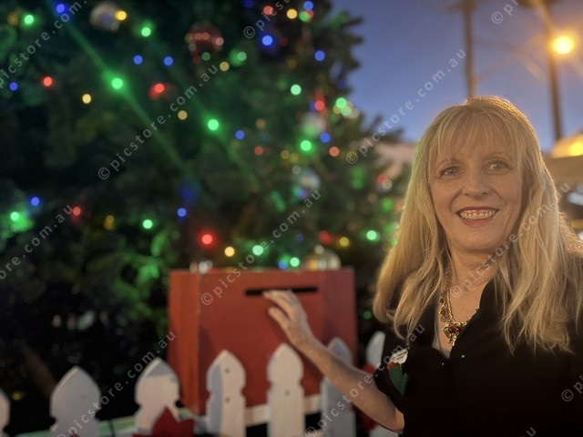Cr Kerri Cryer contemplating posting a letter to Santa at the Beaudesert Christmas tree. (Larraine Sathicq: 521806_14)