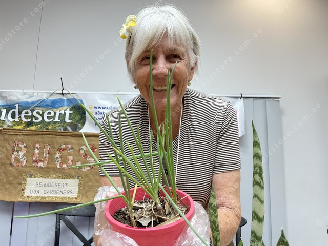 Gardening enthusiast Liz Avery unsuccessfully tries to hide behind a plant at the BUGS display. (Larraine Sathicq: 454237_14)