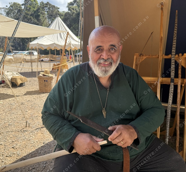 Bowyer Perry Jackson demonstrates how to make a bow. (Larraine Sathicq: 503328_03)