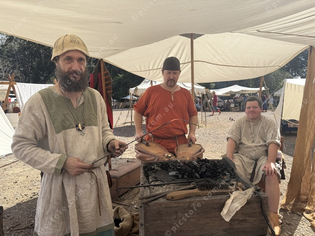 Blacksmith James Simson with Andrey Grafskiy and Phillip Leadbeatter at the Viking Culture Day. (Larraine Sathicq: 503328_04)