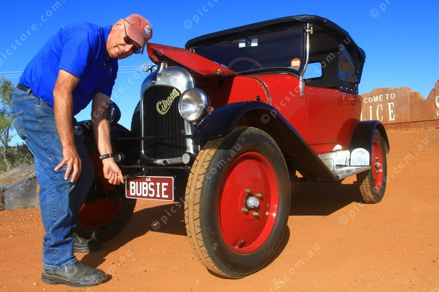 CRANK: Kevin Amos cranks Bubsie into life near Alice Springs. (PIC: PHIL WILLIAMS 490890_09)