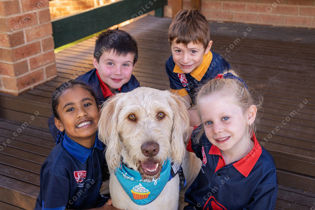 L-R Alesha, Huxley, Archer and Sadie around Buddy.