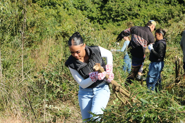 Students launched into the hard work of cutting and carrying wattle trees with enthusiasm. 493035_04