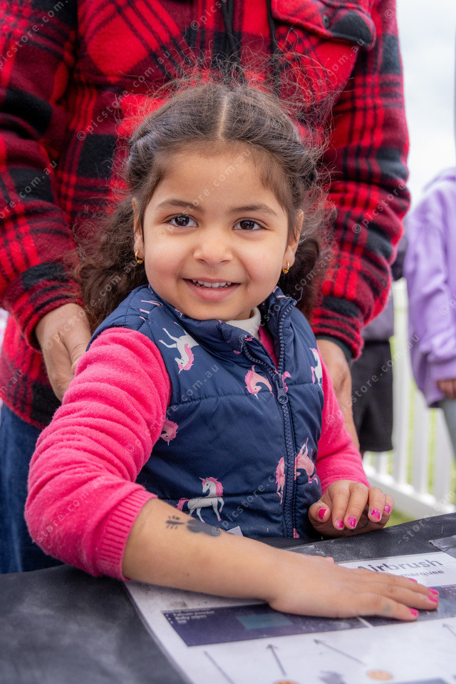 4yo Simran Kaur from Springvale has an Airbrush Tattoo applied. She loved the Herat with an Arrow through it.