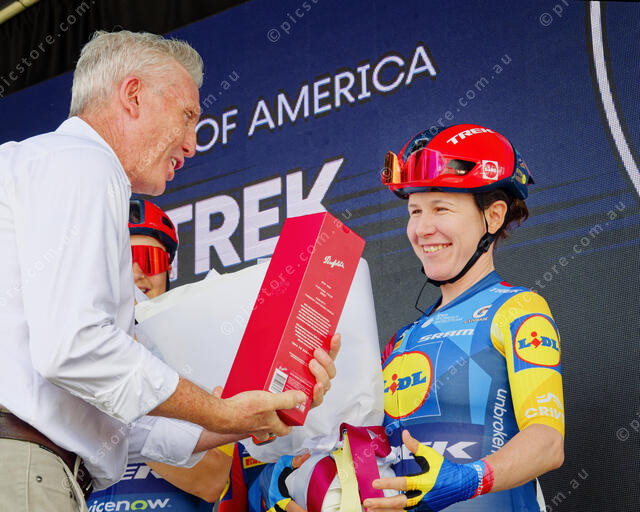 Race director, Scott Sutherland presents flowers and wine to Amanda Spratt to celebrate her last ride in the race (Ivan Kemp) 521168_12