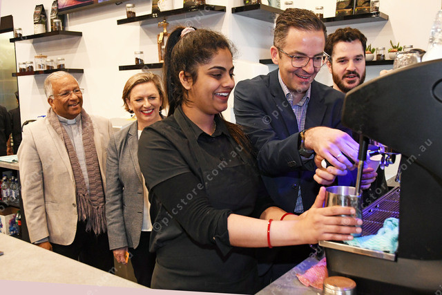 Baristas Nandini and Tommy help Casey Mayor Cr Stefan Koomen make a coffee 492372_09
