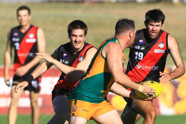 PRESSURE: Lauchlan Lake comes under pressure from Samuel Ward and Taine Stevens. (PIC: PHIL WILLIAMS 487143_08)
