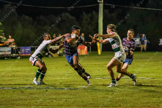 CQ’s Tevita Naufahu looks to palm off a pair of Ipswich defenders.