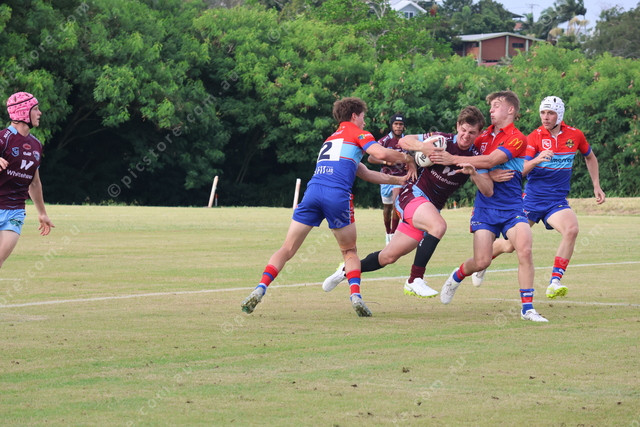 Central Queensland’s Bailey Silvester barges into the Western Clydesdales’ defence.