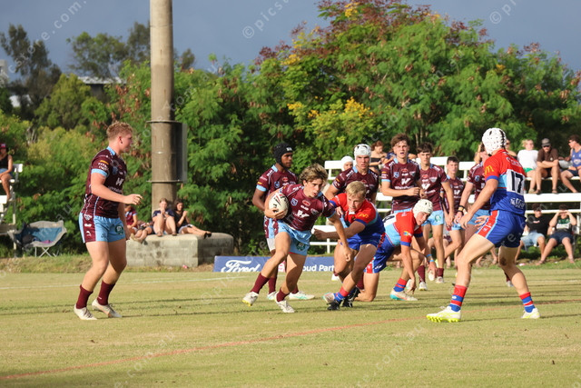 Central Queensland’s hat-trick hero Romen Conway shrugs off some defenders. (Sophie Mossman:536355)