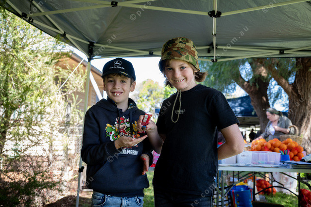 Mason Morrow, 8, and his friend Finn Fagan, 8 with their racing snails. Picture: Ben Gross