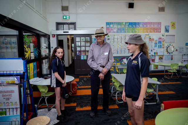 School captains Dakota Babington and Violet Purcell give a tour to former student Barrie MacMillan. Picture: Ben Gross