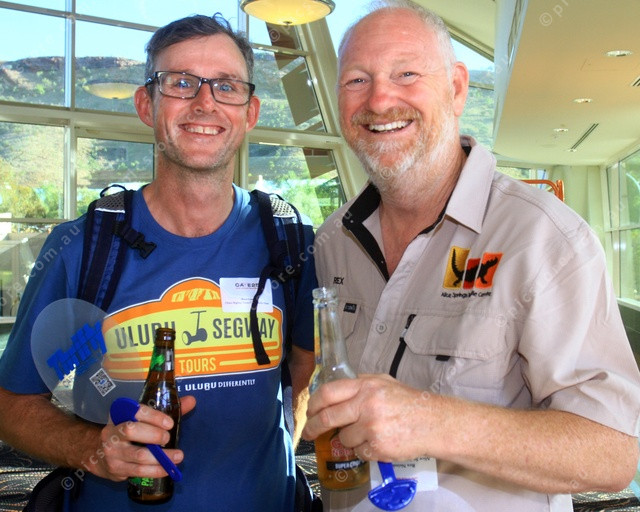 SMILES: Brent Carrail and Rex Neindorf are all smiles before the TCA meeting. (PIC: Tourism Central Australia)