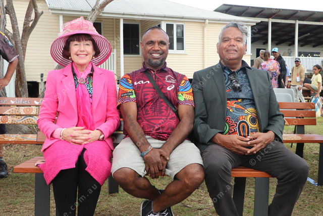 South Burnett mayor Kathy Duff, Crow’s Barbershop owner Tyrone Murray, and Cherbourg mayor Bruce Simpson. Mr Murray was the driver behind the idea of the benches, with both councils jumping on the opportunity to collaborate. 498957_05