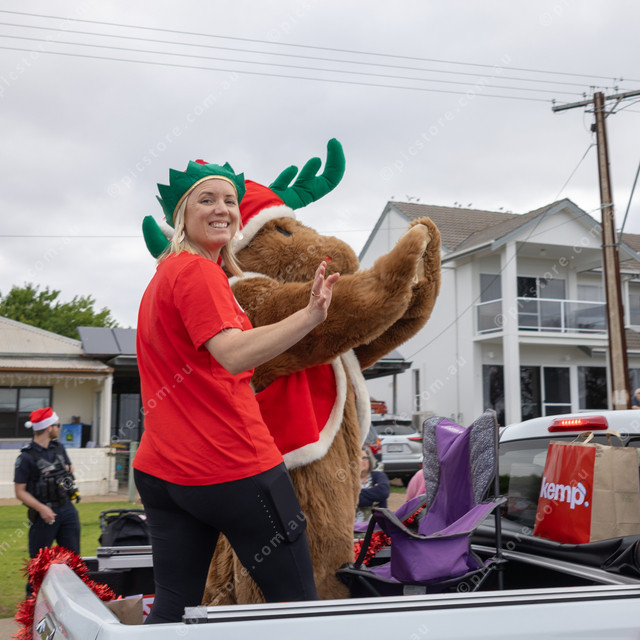 Jade Fraser and a reindeer wave to the crowd from the Kemp Real Estate float. (526113_16)