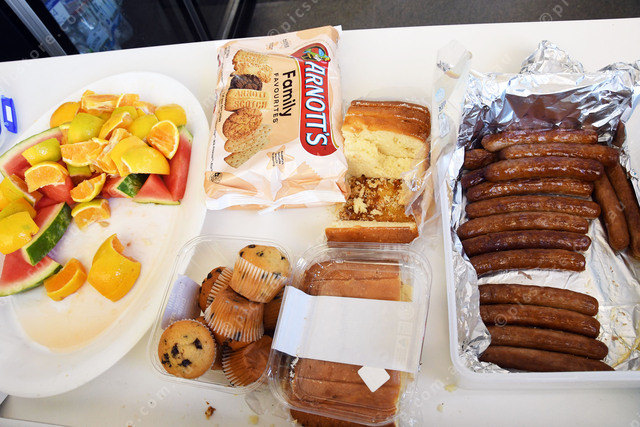 CRICKET SNICKS Tea break, an array of choices at the High School oval, fruit, muffins, biscuits and snags in bread. 456366_02