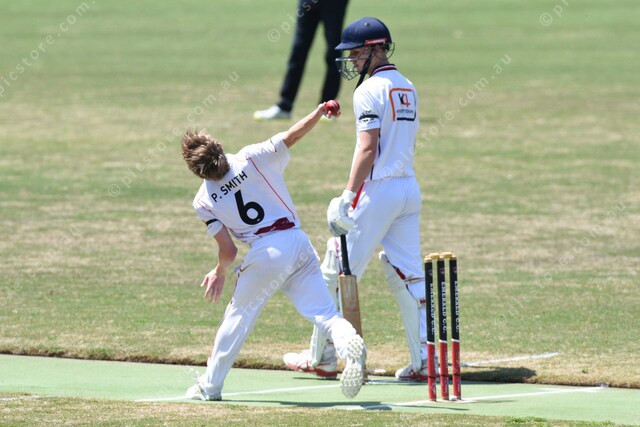 Paxon Smith (Merinda Park) bowls to Trent Rolfs (Emerald). Batsman in this pic is Ethan Crosher (Emerald). 514277_05