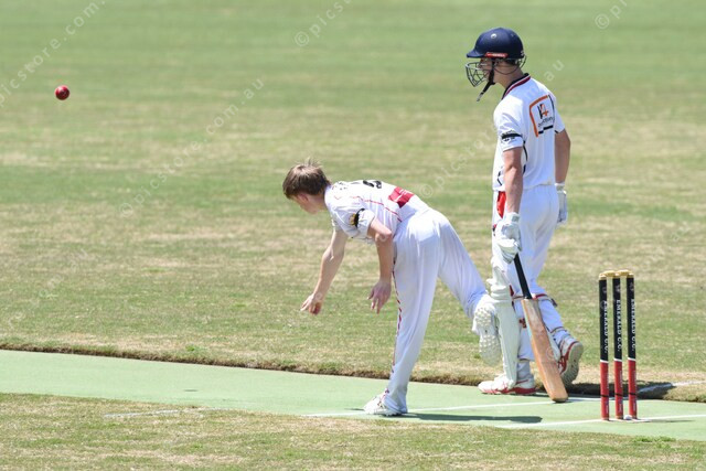 Paxon Smith (Merinda Park) bowls to Trent Rolfs (Emerald). Batsman in this pic is Ethan Crosher (Emerald). 514277_17