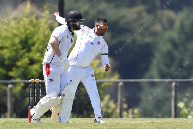 Leigh Paterson (Merinda Park) bowls to Ethan Crosher (Emerald). Batsman in this pic is Trent Rolfs (Emerald). 514277_19