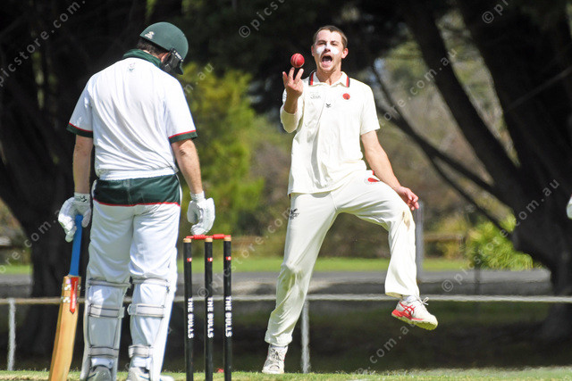 Thomas Hussey can’t seem to believe he’s out after a super athletic caught and bowled by Joshua Grogan 466754_55