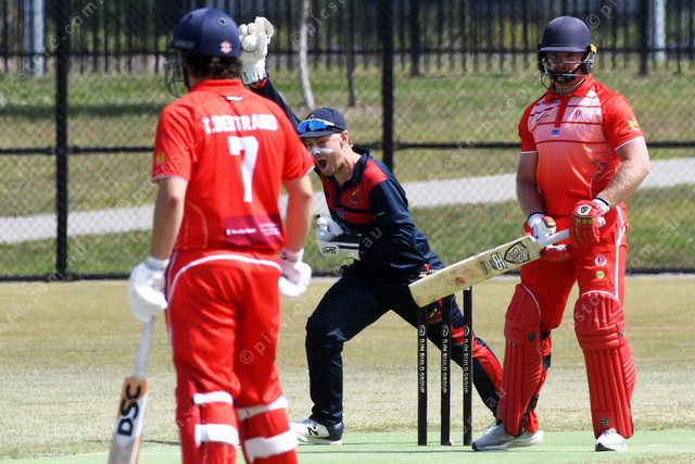 Zac Davis catches the fine nick to dismiss Tobias Van den heever with Shiran Rathnayake first delivery 451348_07