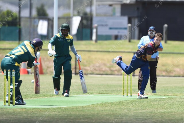 Marcus Martini (Pakenham) bowls to Jack James (Officer). Officer batsman Chandrika Wathukarage watching. 528970_33
