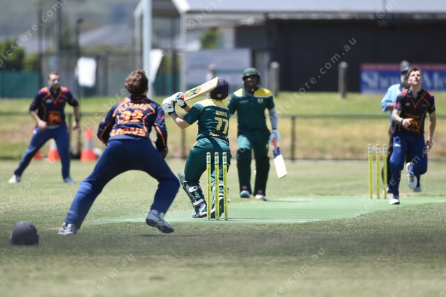 Jack James (Officer) hits a ball from bowler Marcus Martini (Pakenham). I think this is the ball when he went out. 528970_35