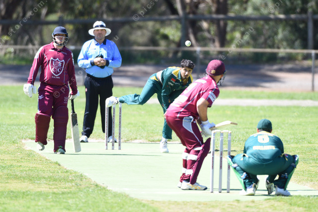 Agamjot Dhindsa (Officer) bowls to Ben Amos (Upper Beaconsfield). 511079_06