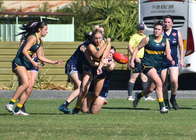 Central’s Jorja Yorath attempts to handball as she is tackled by two Southern Districts opponents. (489824)