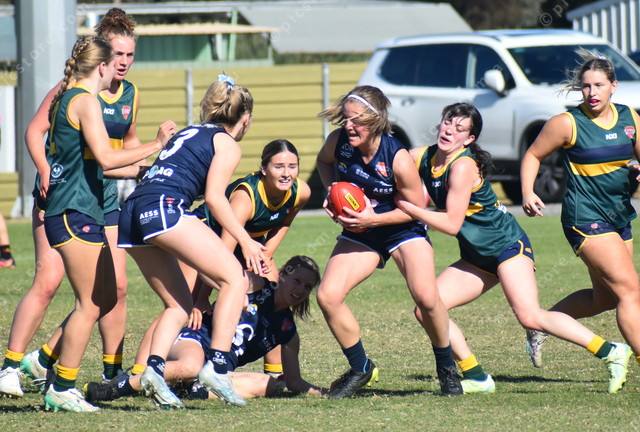 Southern Districts’ Ellie Fry is tackled by Central’s Hayley Henke. (489824)