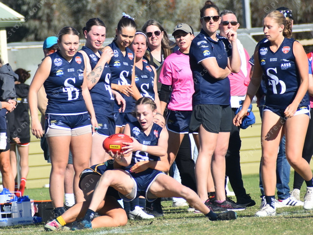 Southern Districts’ Maddy Craggs is brought down by Central’s Ellie Ward in front of her teammates on the sidelines. (489824)