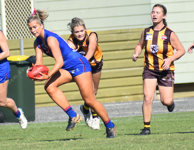Eastern’s Amelie D’Arcy with the ball as Eyre Peninsula’s Kirralee Johns grabs on to her guernsey. (489827)