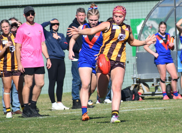 Eyre Peninsula’s Tayah Liffner about to go for a big kick near the boundary. (489827)