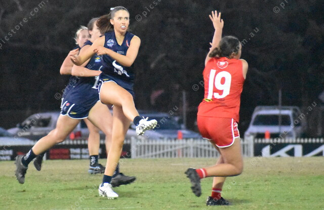 Southern Districts’ Tiana Lush kicks towards goal, past Northern’s Aliesha Kennedy. (489844)