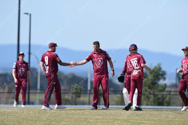 Yashan Gunasinghage (Clyde) is out. Centre is bowler Scott Pitcher (Upper Beac). 507562_27