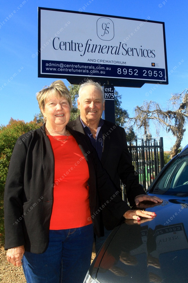 Lynette and Nick Absalom outside the Centre Funerals chapel. (PIC: PHIL WILLIAMS 489616_09)