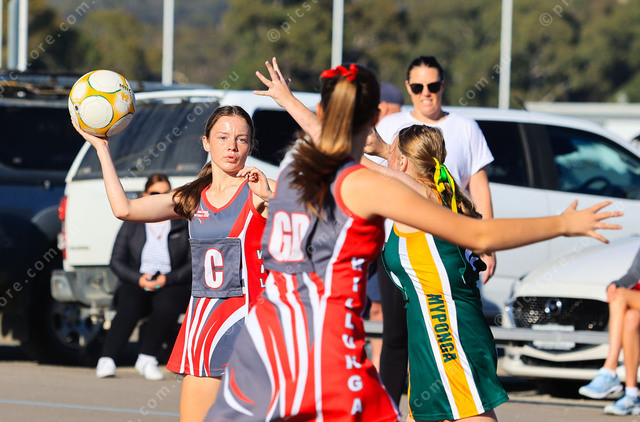 Willunga centre Cerys Thomas looks for options down the court during her Inter 3 match against Myponga. Photo: Jesse Ehlers. 405513_03