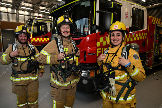 Firefighters from Mernda are taking part in the Melbourne Firefighter Stair climb. Pic of David Gent, Ethan Broomhall and Stephanie Tamer. Photo by Damjan Janevski. 480548_03