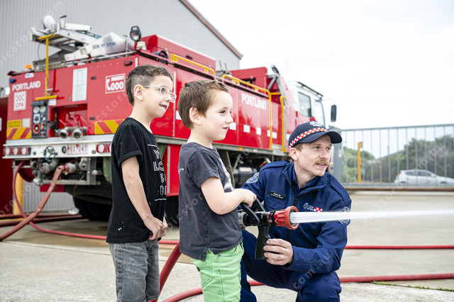 511338_04 Paras Tsimiklis, 6, and his brother Peter Tsimiklis, 4, with Portland CFA member Kalian Gee.