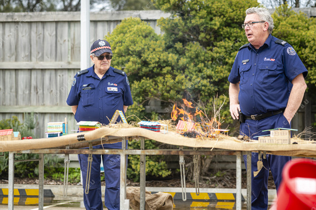 511338_20 Portland CFA members Ray Polaski and Ian Hamley on the fire table demonstrating the spread of fire.