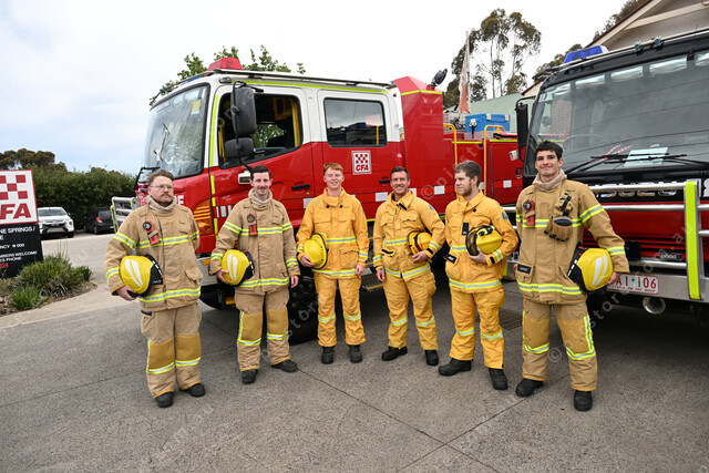 CFA Caroline Springs open day. Pic of volunteers firefighters: Aaron Krizowsky, Daniel Piggott, Cameron Sinclair, James Lambrianidis, Michael Jordan and Cooper Larkin. (Damjan Janevski). 510465_06