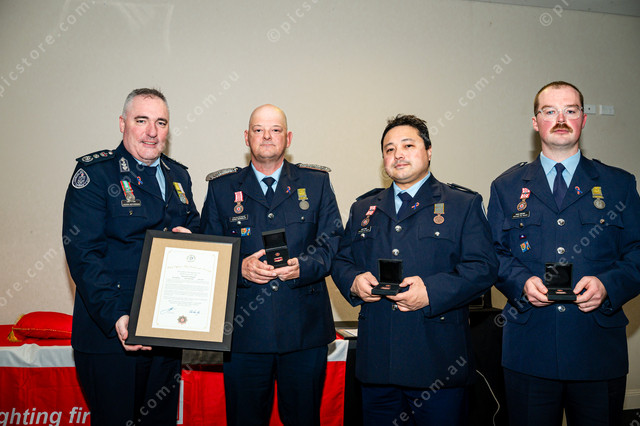 487190_23 CFA Chief Officer Jason Heffernan with Citation for Courage awardees (the three firefighters who tried to save the life of fellow firefighter Garry Mallen) Adam Hermelin, John Wolf, Ryan Delony.